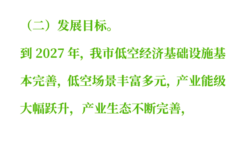 “到2027年,中山市低空經(jīng)濟(jì)基礎(chǔ)設(shè)施基本完善,低空場景豐富多元,產(chǎn)業(yè)能級大幅躍升,產(chǎn)業(yè)生態(tài)不斷完善,初 步形成協(xié)同融合發(fā)展的低空經(jīng)濟(jì)產(chǎn)業(yè)鏈,成為我市未來經(jīng)濟(jì)重要增長極?!笔恰吨猩绞械涂战?jīng)濟(jì)高質(zhì)量發(fā)展行動方案(2024—2027年)》中提到的發(fā)展目標(biāo),中山市發(fā)展低空經(jīng)濟(jì),布局低空產(chǎn)業(yè)。