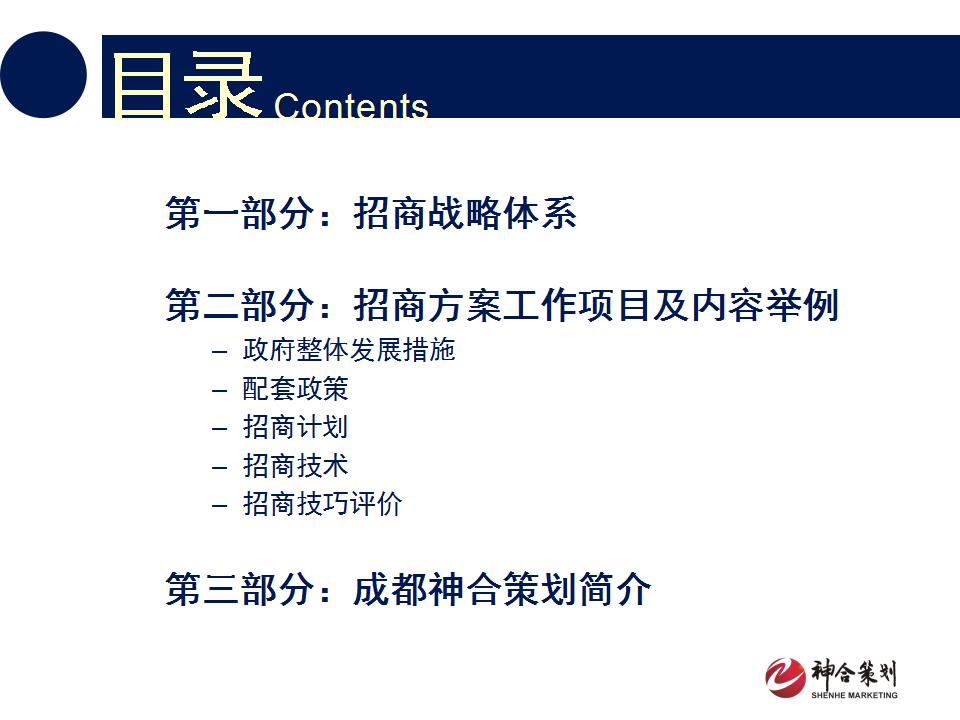 產(chǎn)業(yè)園區(qū)招商策劃方案,供參考。 第一部分:招商戰(zhàn)略體系 第二部分:招商方案工作項(xiàng)目及內(nèi)容舉例 第三部分:成都神合策劃簡介