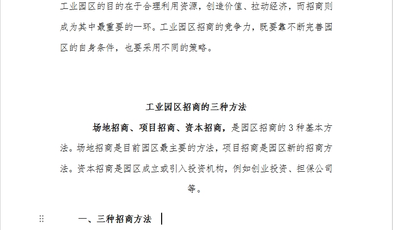 工業(yè)園區(qū)招商方法方案策略 一、三種招商方法 二、用什么項(xiàng)目吸引投資商 三、工業(yè)園怎樣招商 1、準(zhǔn)確定位目標(biāo)企業(yè) 2、準(zhǔn)確設(shè)定招商標(biāo)志語 3、辦一份園區(qū)報(bào) 4、商業(yè)性運(yùn)營 5、某些具體招商方法 6、人才標(biāo)準(zhǔn)