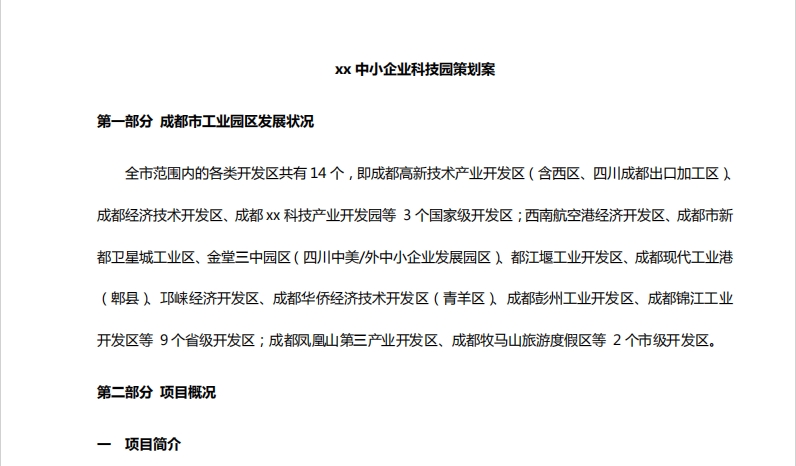 成都工業(yè)園區(qū)項(xiàng)目招商策劃方案: 第一部分 成都市工業(yè)園區(qū)發(fā)展?fàn)顩r 第二部分 項(xiàng)目概況 一 項(xiàng)目簡介 二 項(xiàng)目用地描述 第三部分 項(xiàng)目策劃方案 一 項(xiàng)目SWOT 分析 二 項(xiàng)目劣勢(W ) 三 項(xiàng)目機(jī)會(O ) 四 項(xiàng)目威脅(T )