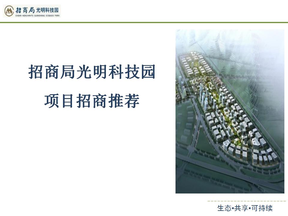 廣東省深圳市招商局光明科技園項(xiàng)目招商推薦手冊: 一、光明 — 繼福田、前海后,深圳下一個(gè)都市中心 二、四通八達(dá)的交通網(wǎng)絡(luò),半小時(shí)直通廣深港中心區(qū) 三、總體規(guī)劃為三大功能區(qū):招商局智慧城將結(jié)合光明新區(qū)獨(dú)特的生態(tài)資源和城市形態(tài)進(jìn)行規(guī)劃設(shè)計(jì),智慧城規(guī)劃主要分為三大區(qū)域。 01產(chǎn)業(yè)園區(qū),充分利用加速器專業(yè)服務(wù)平臺和投融資服務(wù)平臺,為從事產(chǎn)業(yè)研發(fā)環(huán)節(jié)的創(chuàng)新型中小企業(yè)和龍頭企業(yè),打造科技創(chuàng)新發(fā)展的基地