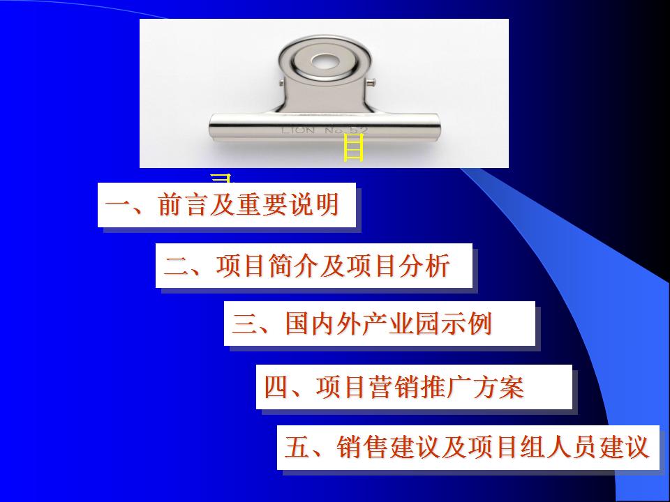 廣州天安番禺節(jié)能科技園策劃推廣方案PPT 一、前言及重要說明 二、項(xiàng)目簡(jiǎn)介及項(xiàng)目分析 三、國(guó)內(nèi)外產(chǎn)業(yè)園示例 四、項(xiàng)目營(yíng)銷推廣方案 五、銷售建議及項(xiàng)目組人員建議