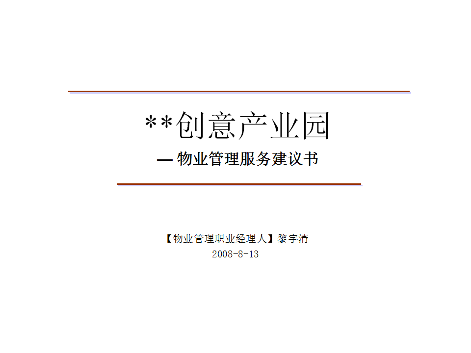創(chuàng)意產(chǎn)業(yè)園物業(yè)管理服務(wù)建議書(shū) 1.為何寫(xiě)此建議書(shū)? 2.建議書(shū)內(nèi)容 2.1 舊廠區(qū)改造的創(chuàng)意產(chǎn)業(yè)園的概述 2.2 某某創(chuàng)意產(chǎn)業(yè)園給我的啟示與震撼! 2.3 試論創(chuàng)意產(chǎn)業(yè)園的用戶需要什么樣的物業(yè)服務(wù)? 2.4 如何滿足創(chuàng)意產(chǎn)業(yè)園客戶需要的物業(yè)服務(wù)? 2.5 誰(shuí)來(lái)滿足客戶需要? 2.6 制定了什么樣的5年物業(yè)服務(wù)計(jì)劃? 3.關(guān)于舊廠區(qū)改造的創(chuàng)意產(chǎn)業(yè)園展望及產(chǎn)業(yè)園5年規(guī)劃思