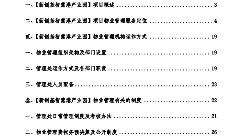 【新創(chuàng)基智慧港產(chǎn)業(yè)園】項(xiàng)目物業(yè)服務(wù)理念 一、【新創(chuàng)基智慧港產(chǎn)業(yè)園】項(xiàng)目概述 二、【新創(chuàng)基智慧港產(chǎn)業(yè)園】項(xiàng)目物業(yè)管理服務(wù)定位 【新創(chuàng)基智慧港產(chǎn)業(yè)園】物業(yè)管理機(jī)構(gòu)運(yùn)作方式 一、物業(yè)管理組織架構(gòu)及部門設(shè)置 二、管理處運(yùn)作方式及各部門職責(zé) 三、管理處人員配備 【新創(chuàng)基智慧港產(chǎn)業(yè)園】物業(yè)管理有關(guān)的制度 一、管理處日常管理制度及考核辦法 二、物業(yè)管理費(fèi)帳務(wù)預(yù)決算及公開(kāi)制度 【新