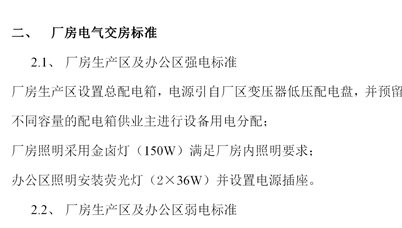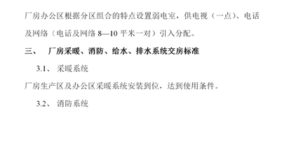 工業(yè)廠房土建、水暖電交房標準: 一、廠房土建鋼構(gòu)交房標準 二、廠房電氣交房標準 三、廠房采暖、消防、給水、排水系統(tǒng)交房標準 四、標準廠房租賃物業(yè)費