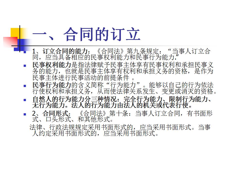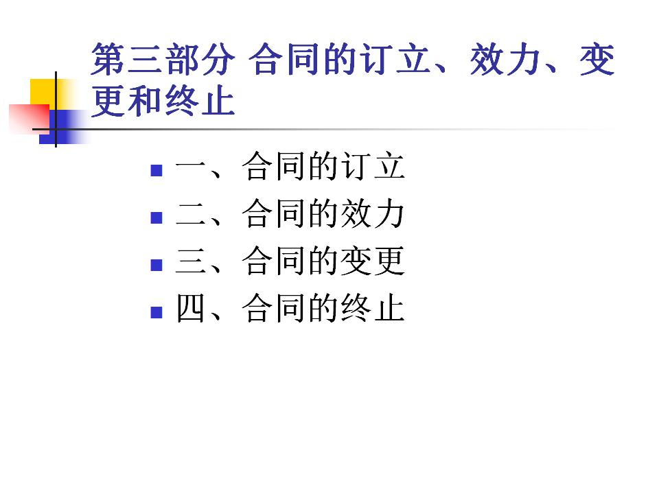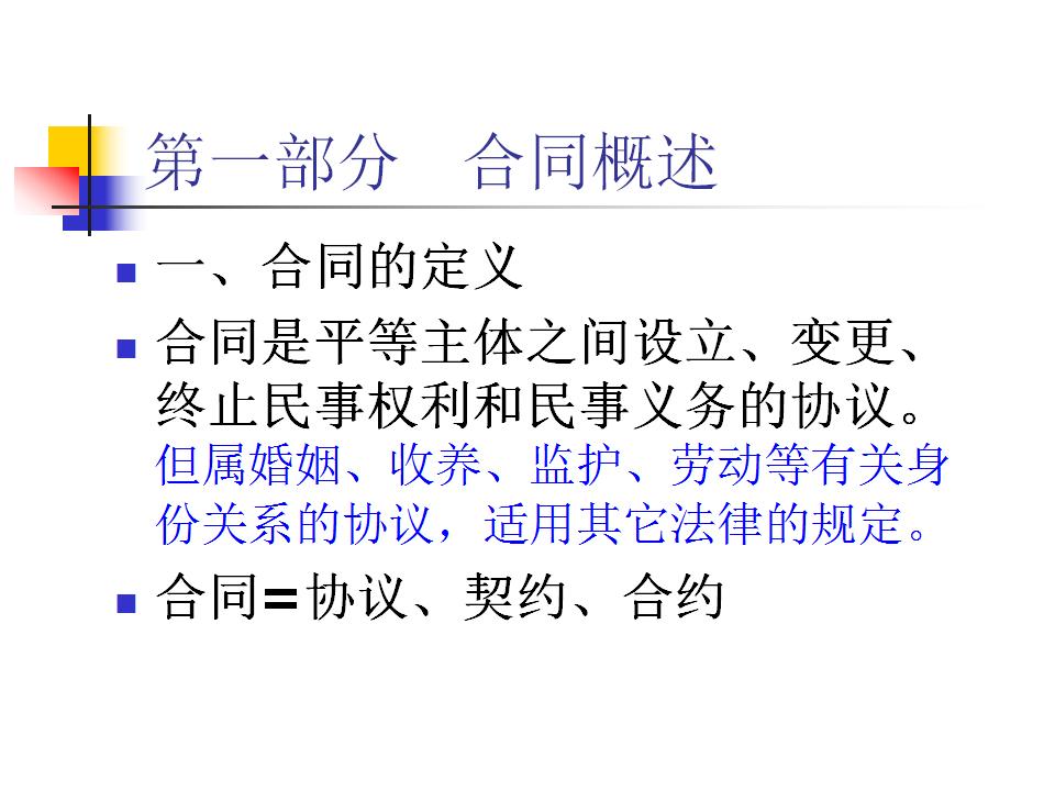 合同基礎(chǔ)知識及簽署注意事項(xiàng)指引: 第一篇 合同基礎(chǔ)知識培訓(xùn) 第一部分 合同概述 第二部分 合同的訂立、效力、變更和終止 第三部分 合同基本法律概念的區(qū)分 第二篇 合同簽署指引培訓(xùn) 第一部分 合同主要風(fēng)險點(diǎn) 第二部分 合同審批制度的優(yōu)化