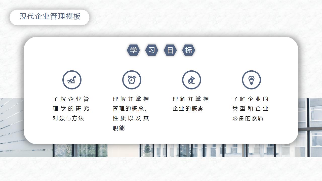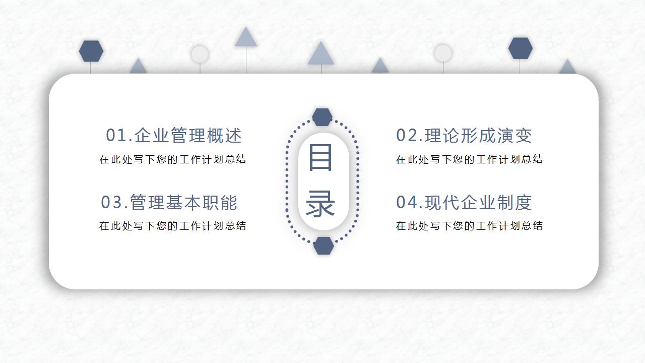 類型風(fēng)格:大氣藍(lán)灰配色,簡約設(shè)計(jì),動(dòng)態(tài)播放,通用性強(qiáng)。 適用:企業(yè)管理知識(shí)培訓(xùn)