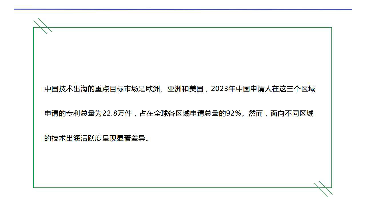 2023年新能源汽車產(chǎn)業(yè)技術(shù)出海研究報(bào)告:中國(guó)技術(shù)出海的重點(diǎn)目標(biāo)市場(chǎng)是歐洲、亞洲和美國(guó),2023年中國(guó)申請(qǐng)人在這三個(gè)區(qū)域申請(qǐng)的專利總量為22.8萬(wàn)件,占在全球各區(qū)域申請(qǐng)總量的92%。然而,面向不同區(qū)域的技術(shù)出海活躍度呈現(xiàn)顯著差異。