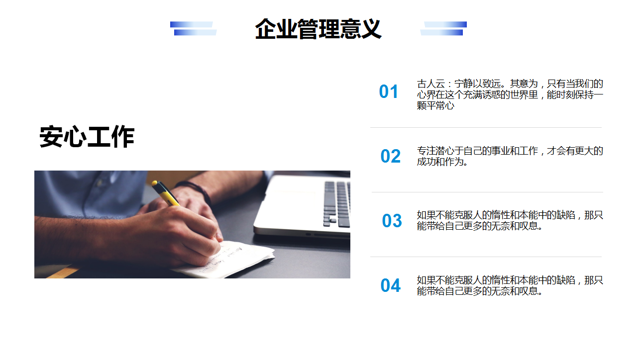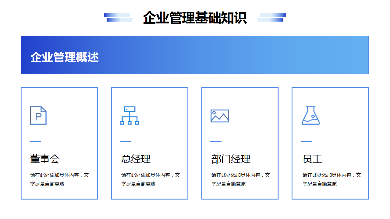 適用:企業(yè)管理基礎(chǔ)知識培訓 風格類型:藍色商務(wù) 所有文字、圖片內(nèi)容可修改調(diào)整