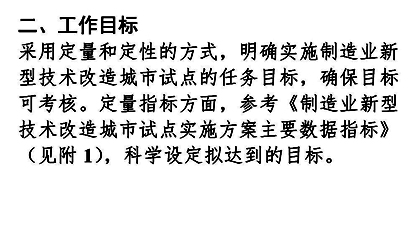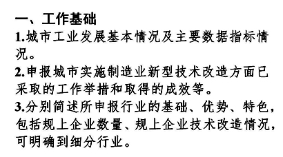 由省級(jí)工業(yè)和信息化、財(cái)政部門組織城市申報(bào)。申報(bào)城市應(yīng)編制實(shí)施方案,實(shí)施期為2-3年,應(yīng)包括工作基礎(chǔ)、工作目標(biāo)、實(shí)施內(nèi)容、項(xiàng)目總體情況、資金使用方向、考核指標(biāo)、保障措施、其他材料及項(xiàng)目清單等內(nèi)容,并附相關(guān)證明材料(參考附件)。