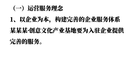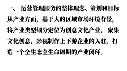 創(chuàng)意文化產(chǎn)業(yè)基地運(yùn)營管理參考方案:明確發(fā)展目標(biāo):為文化產(chǎn)業(yè)園區(qū)提供清晰的發(fā)展方向和目標(biāo),幫助園區(qū)管理者和利益相關(guān)者達(dá)成共識。優(yōu)化資源配置:指導(dǎo)園區(qū)如何更有效地利用和分配資源,包括資金、人才、技術(shù)等,以實現(xiàn)最大化的經(jīng)濟(jì)效益和社會效益。促進(jìn)產(chǎn)業(yè)集聚:通過吸引和培育文化企業(yè),形成具有競爭力的產(chǎn)業(yè)集群,增強(qiáng)園區(qū)的產(chǎn)業(yè)吸引力和輻射力。提升品牌價值:通過品牌建設(shè)和營銷活動,提高園區(qū)的知名度和影響力,吸引更多的投資和游客。創(chuàng)新商業(yè)模式:探索和實施創(chuàng)新的商業(yè)模式,為園區(qū)帶來多元化的收入來源,提高盈利能力和可持續(xù)發(fā)展能力。增強(qiáng)運(yùn)營效率:通過科學(xué)的管理和運(yùn)營,提高園區(qū)的運(yùn)營效率,降低運(yùn)營成本。