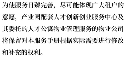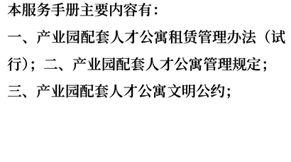 產(chǎn)業(yè)園人才公寓服務(wù)手冊(cè):產(chǎn)業(yè)園人才公寓服務(wù)手冊(cè)通常屬于物業(yè)管理類資料。主要涉及人才公寓的運(yùn)營(yíng)管理、居住服務(wù)、維護(hù)保養(yǎng)、安全監(jiān)管等方面的內(nèi)容,是物業(yè)管理的重要組成部分。公寓介紹:包括人才公寓的位置、戶型、設(shè)施等基本信息。入住與退房流程:明確租戶入住和退房的標(biāo)準(zhǔn)流程和所需材料。費(fèi)用說明:列出租金、押金、管理費(fèi)、水電費(fèi)等費(fèi)用的收取標(biāo)準(zhǔn)和支付方式。管理規(guī)定:包括公寓的管理規(guī)章、租戶的權(quán)利和義務(wù)、違規(guī)處理辦法等。