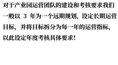 產業(yè)園運營團隊組織架構和運營考核指導辦法:對于產業(yè)園運營團隊的建設和考核要求我們一般以 3 年為一個遠期規(guī)劃,設定長期運營目標,并將目標拆分為每一年的運營指標,以此設定年度考核具體要求。