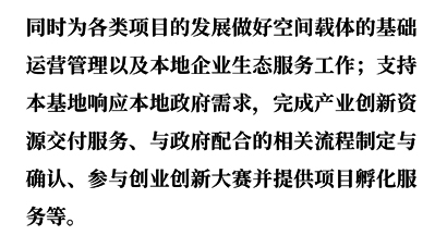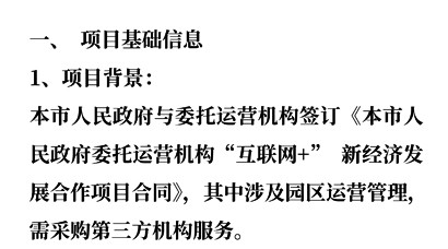 孵化器委托運(yùn)營(yíng)方案:其中涉及園區(qū)運(yùn)營(yíng)管理,需采購(gòu)第三方機(jī)構(gòu)服務(wù)。具有成熟電商企業(yè)招募、孵化能力、云服務(wù)售前支持能力等可以作為評(píng)標(biāo)加分項(xiàng)。優(yōu)先考慮總部在中區(qū)及附近城市的運(yùn)營(yíng)機(jī)構(gòu)。