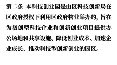 科技創(chuàng)業(yè)園園區(qū)管理辦法:為規(guī)范本科技創(chuàng)業(yè)園的使用和管理, 充分發(fā)揮創(chuàng)業(yè)園對科技企業(yè)和創(chuàng)業(yè)人才的聚集作用,提升創(chuàng)業(yè)園的管理和服水平,促進科技創(chuàng)新發(fā)展