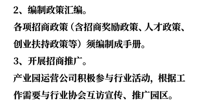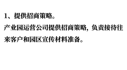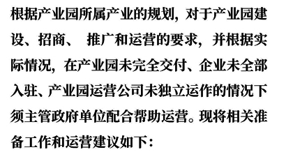 新產(chǎn)業(yè)園運營準備指導手冊:根據(jù)產(chǎn)業(yè)園所屬產(chǎn)業(yè)的規(guī)劃,對于產(chǎn)業(yè)園建設(shè)、招商、 推廣和運營的要求,并根據(jù)實際情況,在產(chǎn)業(yè)園未完全交付、企業(yè)未全部入駐、產(chǎn)業(yè)園運營公司未獨立運作的情況下須主管政府單位配合幫助運營。