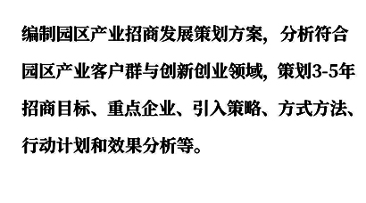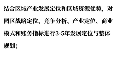園區(qū)產(chǎn)業(yè)服務(wù)運(yùn)營績效考核辦法:結(jié)合區(qū)域產(chǎn)業(yè)發(fā)展定位和區(qū)域資源優(yōu)勢,對園區(qū)戰(zhàn)略定位、競爭分析、產(chǎn)業(yè)定位、商業(yè)模式和賬務(wù)指標(biāo)進(jìn)行3-5年發(fā)展定位與整體規(guī)劃等。