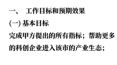 【投標書】產業(yè)園委托運營方案:1.完成甲方提出的所有指標; 2.幫助更多的科創(chuàng)企業(yè)進入該市的產業(yè)生態(tài);3.將產業(yè)園項目打造成全國該產業(yè)領域內具有一定影響力的典型項目;打造省級雙創(chuàng)領域新名片,并獲得從國家到地方各級政府的肯定。