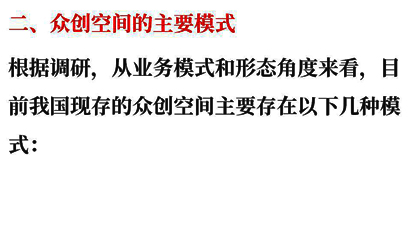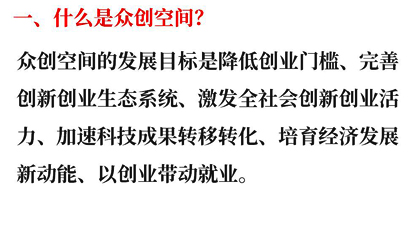 眾創(chuàng)空間主要的幾種模式:眾創(chuàng)空間的發(fā)展目標(biāo)是降低創(chuàng)業(yè)門檻、完善創(chuàng)新創(chuàng)業(yè)生態(tài)系統(tǒng)、激發(fā)全社會創(chuàng)新創(chuàng)業(yè)活力、加速科技成果轉(zhuǎn)移轉(zhuǎn)化、培育經(jīng)濟發(fā)展新動能、以創(chuàng)業(yè)帶動就業(yè)。