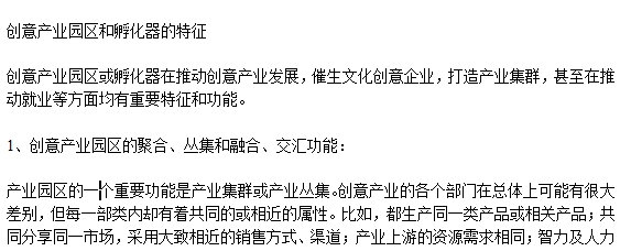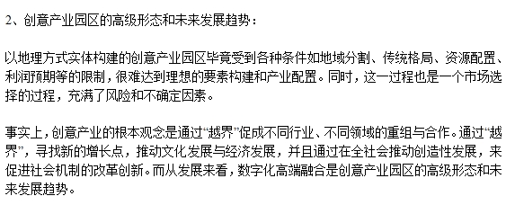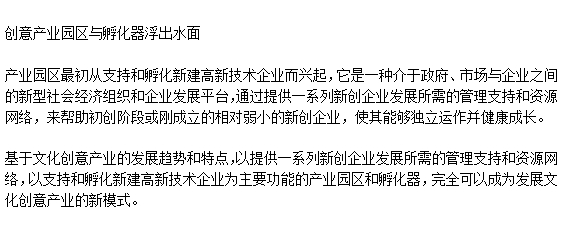 一、文化創(chuàng)意產(chǎn)業(yè)興起 二、創(chuàng)意產(chǎn)業(yè)園區(qū)與孵化器浮出水面 三、創(chuàng)意產(chǎn)業(yè)園區(qū)和孵化器的特征 1、創(chuàng)意產(chǎn)業(yè)園區(qū)的聚合、叢集和融合、交匯功能 2、創(chuàng)意產(chǎn)業(yè)園區(qū)的高級形態(tài)和未來發(fā)展趨勢