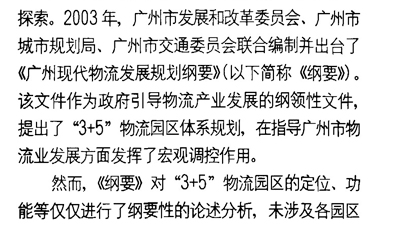 在城市化快速發(fā)展與流通日益頻繁的形勢(shì)下,廣州市積極開展物流規(guī)劃系列研究,從起步階段綱要性 文件的制定,逐步走向在社會(huì)主義市場(chǎng)經(jīng)濟(jì)條件下對(duì)物流園區(qū)專項(xiàng)規(guī)劃編制方式方法與技術(shù)路線的探索,促進(jìn)了城市規(guī)劃對(duì)物流園區(qū)建設(shè)的引導(dǎo)從宏觀綱要層面走向可操性較強(qiáng)的實(shí)施控制層面,在構(gòu)筑廣州物流園區(qū)體系的同時(shí),切實(shí)落實(shí)了物流園區(qū)的選址與規(guī)模,制定了具有彈性的規(guī)劃導(dǎo)控,為政府各個(gè)職能部門提供了有效的規(guī)劃、建設(shè)、管理的法定依據(jù)。