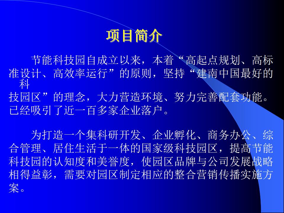 廣州天安番禺節(jié)能科技園策劃推廣方案PPT 一、前言及重要說(shuō)明 二、項(xiàng)目簡(jiǎn)介及項(xiàng)目分析 三、國(guó)內(nèi)外產(chǎn)業(yè)園示例 四、項(xiàng)目營(yíng)銷(xiāo)推廣方案 五、銷(xiāo)售建議及項(xiàng)目組人員建議