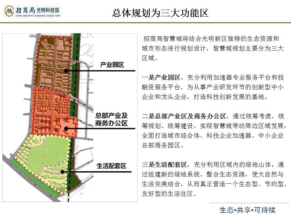 三、總體規(guī)劃為三大功能區(qū):招商局智慧城將結(jié)合光明新區(qū)獨(dú)特的生態(tài)資源和城市形態(tài)進(jìn)行規(guī)劃設(shè)計(jì),智慧城規(guī)劃主要分為三大區(qū)域。