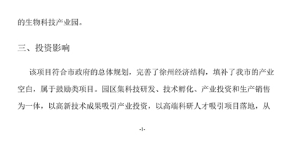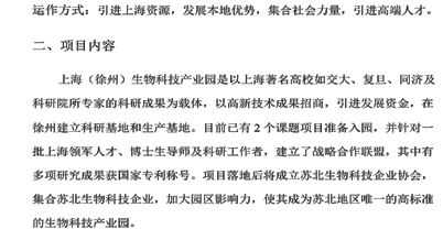上海徐州生物科技產(chǎn)業(yè)園投資策劃案: 一、項目概述 二、項目內(nèi)容 三、投資影響 四、項目規(guī)劃 五、資金投入 六、商會實力 七、遠期規(guī)劃 八、享受政策 八、其他建議