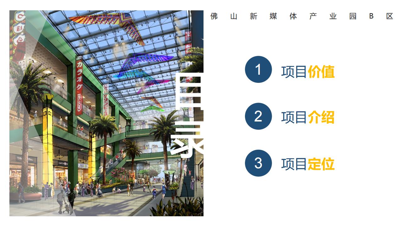 廣東佛山新媒體產(chǎn)業(yè)園區(qū)域招商手冊: 1 區(qū)位價值 2 項(xiàng)目介紹 3 項(xiàng)目定位(項(xiàng)目價值、業(yè)態(tài)規(guī)劃、業(yè)態(tài)分布、招商商家類型) ......