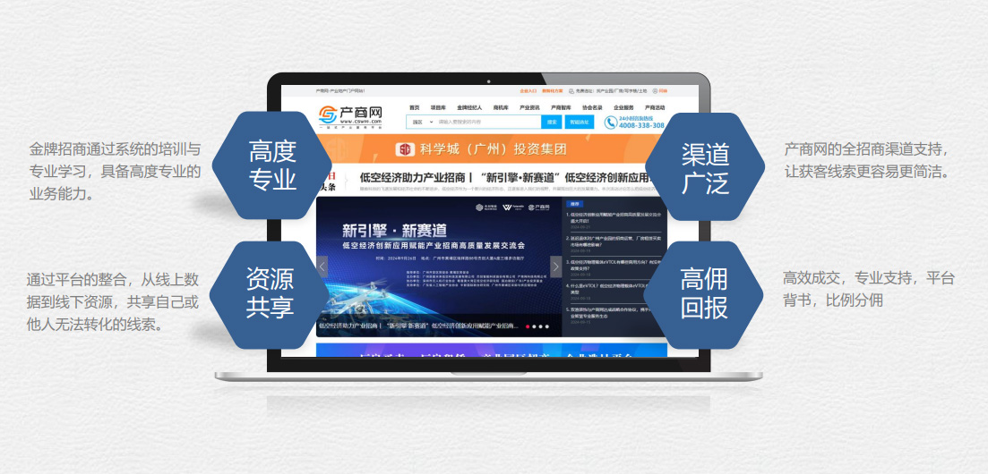 金牌招商是由產(chǎn)商網(wǎng)獨(dú)家提出的專業(yè)行業(yè)概念,是指在產(chǎn)業(yè)地產(chǎn)行業(yè)中,經(jīng)過(guò)產(chǎn)商網(wǎng)嚴(yán)格篩選和認(rèn)證的專業(yè)能力強(qiáng)、素質(zhì)高、評(píng)價(jià)好的項(xiàng)目招商人員。 這類招商專員通常具備較高的專業(yè)素質(zhì)、業(yè)務(wù)能力和誠(chéng)信度,能夠?yàn)橛脩籼峁└哔|(zhì)量的產(chǎn)業(yè)咨詢服務(wù)和優(yōu)質(zhì)的盤源信息! 產(chǎn)業(yè)經(jīng)紀(jì)是一個(gè)競(jìng)爭(zhēng)激烈的行業(yè),需要持續(xù)學(xué)習(xí)并保持對(duì)市場(chǎng)的敏銳洞察力。 保持積極的工作態(tài)度,有效管理壓力,培養(yǎng)解決問(wèn)題的能力。 成功的產(chǎn)業(yè)經(jīng)紀(jì)人通常具有高度的專業(yè)性、人際交往能力和持久的耐心。 記住,成功不會(huì)一蹴而就,它需要時(shí)間、毅力和持續(xù)的努力。