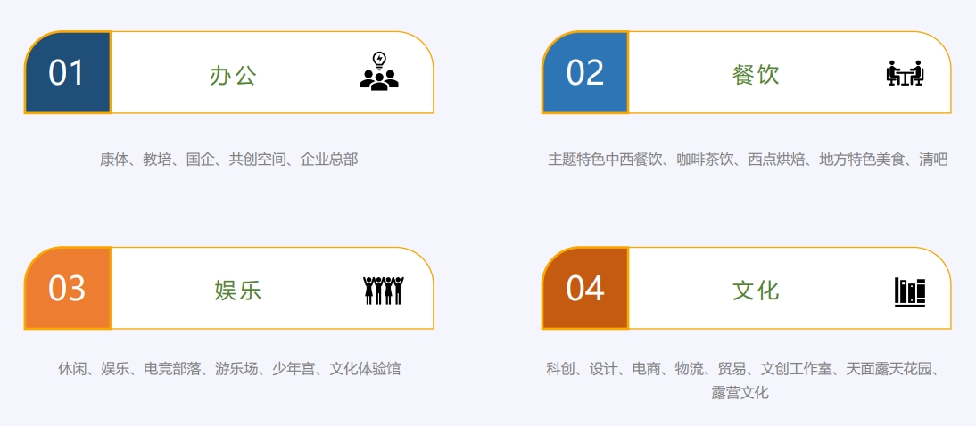 主題特色餐飲茶飲、康體、休閑娛樂、教培、電競等行業(yè)根據(jù)經(jīng)營種類、消費人群每業(yè)態(tài)僅選擇具有代表性1家入 駐,確保業(yè)態(tài)互補,杜絕惡性競爭。