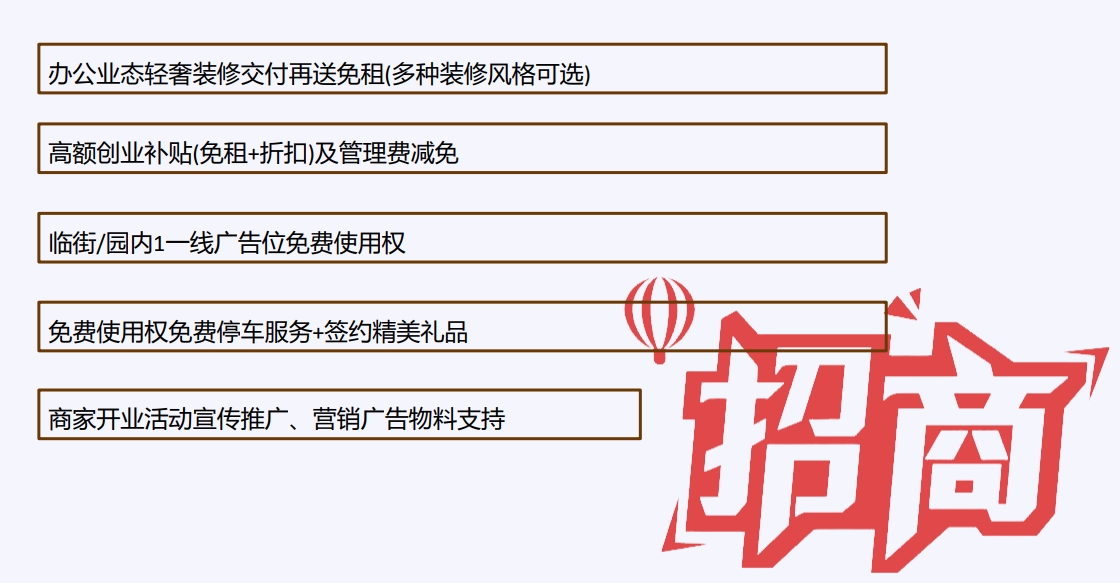 入駐企業(yè)高額創(chuàng)業(yè)補貼、廣告支持、營銷推廣、主題活動引流等市場培育多維并行,均寫入合同范圍以供監(jiān)督。您 只管主內(nèi),其他的交給我們!