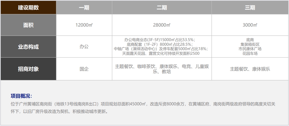 豐澤園—原豐澤高新產(chǎn)業(yè)園(國企)位于廣州.黃埔區(qū).南崗街(地鐵13號線南崗B出口)項目規(guī)劃總面積45000㎡,改造斥資8000余萬。共三期開發(fā),一期12000㎡辦公業(yè)態(tài)已陸續(xù)投入使用,為南崗街政務(wù)樓、廣州高新區(qū)集團、黃浦區(qū)糧儲投資有限公司;二期總面積28000㎡:辦公電商業(yè)態(tài)(3F-5F)15000㎡占比53.5%;底商配套(1F-2F)8000㎡占比28.5%;中軸廣場(演繹活動中心)及停車配套5000㎡占比18%;天面露天花園、露營文化可持續(xù)開發(fā)面積2500㎡。三期3000㎡為底商+集裝箱街區(qū)+市民康體廣場+花園車場。旨在打造地區(qū)首個集辦公、文創(chuàng)、會議會展、餐飲娛樂為一體的旗艦綜合體!