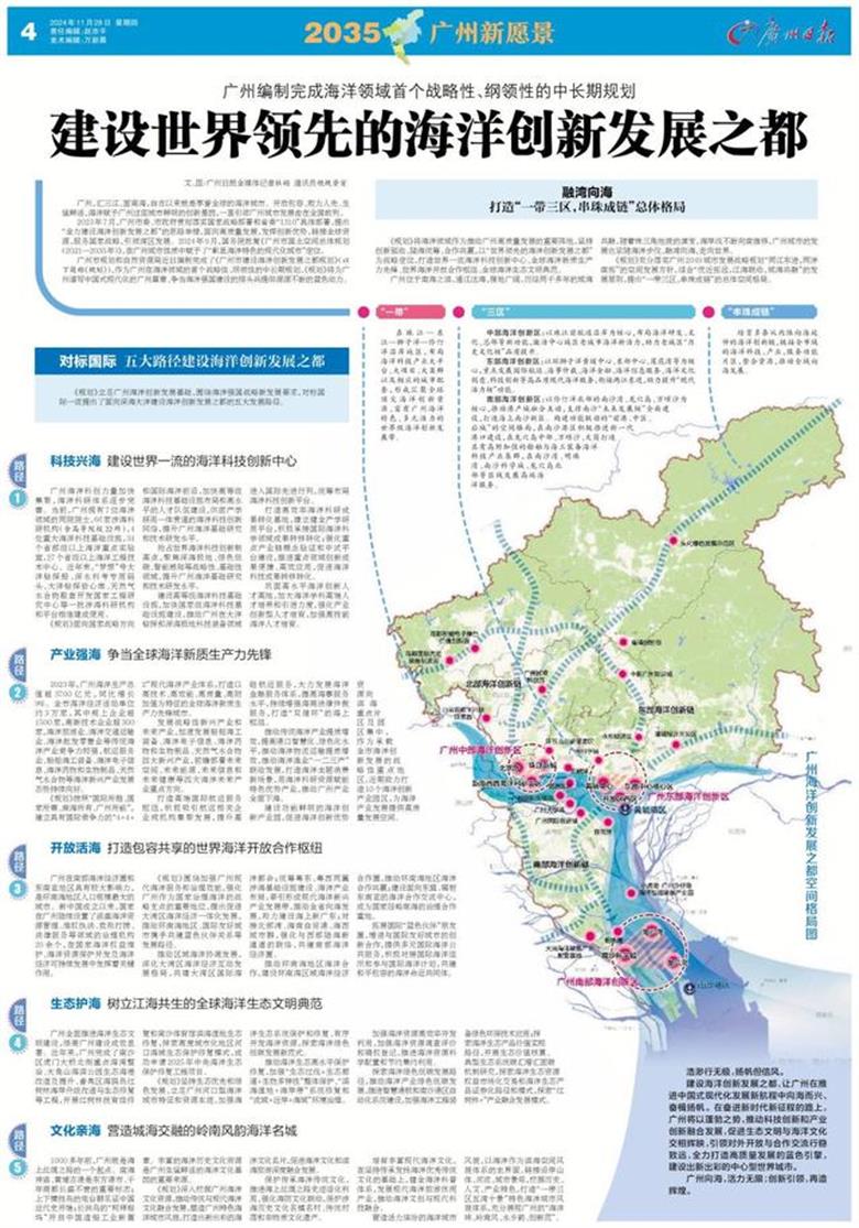 《規(guī)劃》將海洋領域作為推動廣州高質(zhì)量發(fā)展的重要陣地,堅持創(chuàng)新驅動、陸海統(tǒng)籌、合作共贏,以“世界領先的海洋創(chuàng)新發(fā)展之都”為戰(zhàn)略定位,打造世界一流海洋科技創(chuàng)新中心、全球海洋新質(zhì)生產(chǎn)力先鋒、世界海洋開放合作樞紐、全球海洋生態(tài)文明典范。