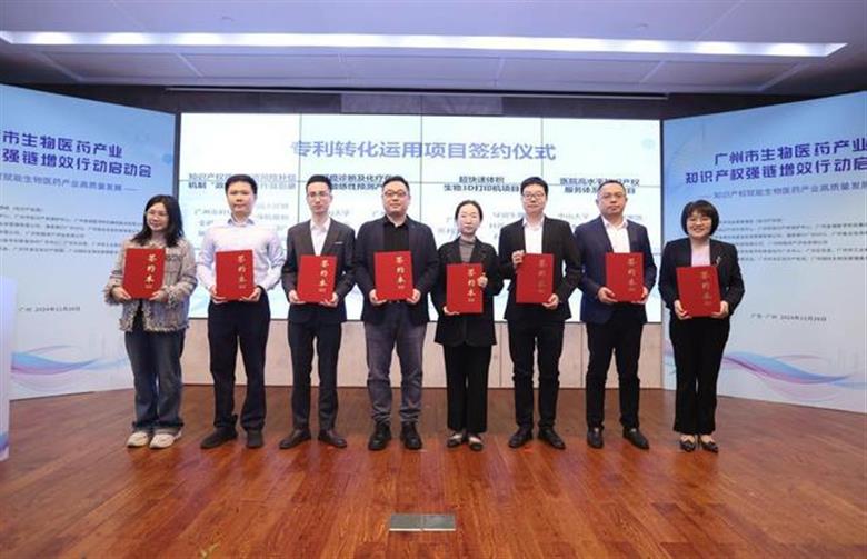現(xiàn)場還舉辦了專利轉(zhuǎn)化運用項目簽約儀式,倡議成立廣州市生物醫(yī)藥產(chǎn)業(yè)知識產(chǎn)權(quán)轉(zhuǎn)化運用服務(wù)聯(lián)合體。