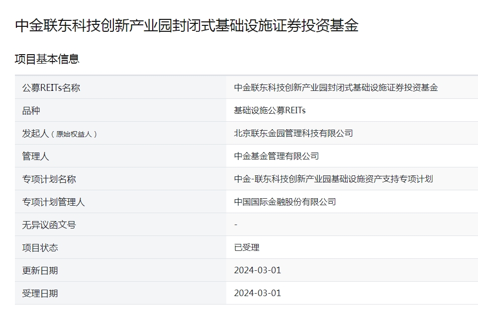 核心提示:3月1日,上交所正式受理了中金聯(lián)東科技創(chuàng)新產業(yè)園封閉式基礎設施證券投資基金。