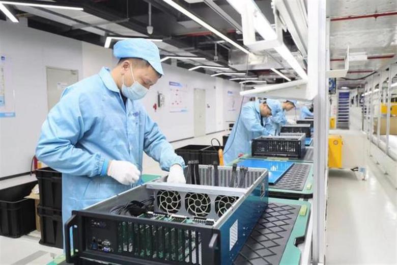 在圖靈新智算(廣州)科技有限公司的算力工廠里,產(chǎn)線緩緩啟動(dòng),工作人員正在井然有序地組裝、測(cè)試,實(shí)現(xiàn)綠色再制造。圖靈新智算是一家聚焦于人工智能方向的全棧智算算力服務(wù)提供商。今年10月,該工廠生成式人工智能產(chǎn)業(yè)工廠正式運(yùn)營(yíng)揭牌,一期工廠面積達(dá)6000平方米,年設(shè)計(jì)產(chǎn)能60000臺(tái)。
