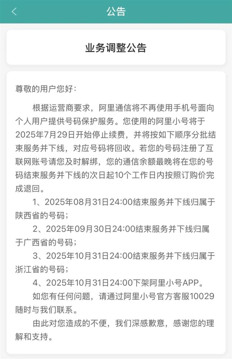 【阿里小號(hào)App7月29日停止續(xù)費(fèi),將于10月31日下架】7月29日,阿里通信發(fā)布公告宣布,根據(jù)運(yùn)營(yíng)商要求,阿里通信將不再使用手機(jī)號(hào)面向個(gè)人用戶提供號(hào)碼保護(hù)服務(wù)。公告表示,用戶使用的阿里小號(hào)將于2025年7月29日開(kāi)始停止續(xù)費(fèi),并將按如下順序分批結(jié)束服務(wù)并下線,對(duì)應(yīng)號(hào)碼將回收。此外,若用戶號(hào)碼已注冊(cè)互聯(lián)網(wǎng)賬號(hào)請(qǐng)及時(shí)解綁,通信余額最晚將在號(hào)碼結(jié)束服務(wù)并下線的次日起10個(gè)工作日內(nèi)按照訂購(gòu)價(jià)完成退回。(騰訊網(wǎng))