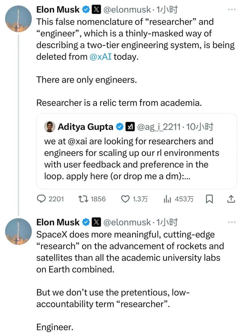 【馬斯克宣布 xAI 取消 “研究員” 職稱,強(qiáng)調(diào)只設(shè)工程師崗位】馬斯克在社交媒體平臺(tái) X上發(fā)布動(dòng)態(tài)回應(yīng)xAI招聘信息,宣布xAI公司將取消 “研究員” 與 “工程師” 這種職稱區(qū)分,今后公司內(nèi)只有 “工程師” 這一稱謂。馬斯克指出,“研究員” 這一術(shù)語(yǔ)是學(xué)術(shù)界遺留下來(lái)的產(chǎn)物,而 “研究員” 和 “工程師” 這種職稱劃分,實(shí)際上是對(duì)兩層級(jí)工程體系的一種掩飾,xAI 決定摒棄這種錯(cuò)誤的命名方式。(新浪財(cái)經(jīng))
