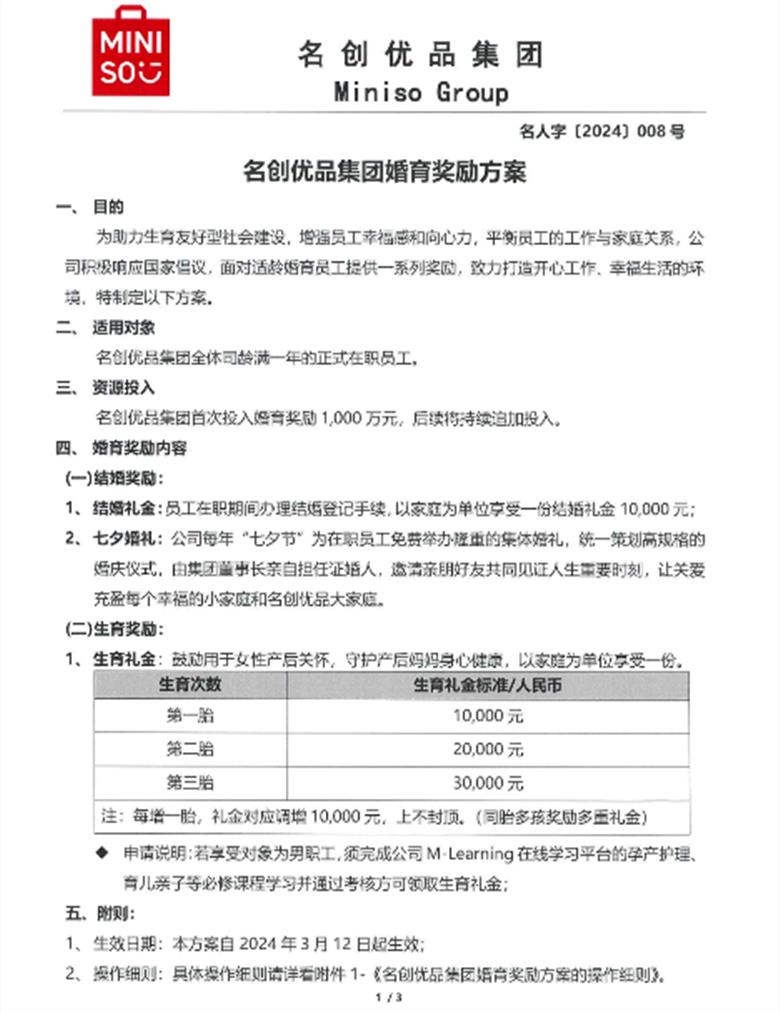 【名創(chuàng)優(yōu)品:投入1000萬(wàn)元支持婚育,一胎獎(jiǎng)1萬(wàn)二胎2萬(wàn)上不封頂】近日,國(guó)家育兒補(bǔ)貼制度實(shí)施方案正式出臺(tái)。在此前,已有企業(yè)先行探索婚育關(guān)懷體系。2024年3月,名創(chuàng)優(yōu)品率先推出《名創(chuàng)優(yōu)品集團(tuán)婚育獎(jiǎng)勵(lì)方案》,首期投入1000萬(wàn)元專項(xiàng)資金設(shè)立名創(chuàng)優(yōu)品婚育基金,為司齡滿一年的在職員工提供全周期婚育保障。據(jù)了解,截至2025年7月,名創(chuàng)優(yōu)品婚育基金已累計(jì)發(fā)放266萬(wàn)元人民幣,惠及超200個(gè)員工家庭,其中111對(duì)新婚員工獲得萬(wàn)元結(jié)婚禮金,114個(gè)生育家庭享受"一胎獎(jiǎng)1萬(wàn)、二胎獎(jiǎng)2萬(wàn)、上不封頂"的梯度激勵(lì),與國(guó)家新出臺(tái)的育兒補(bǔ)貼形成"企業(yè)+政府"的雙重保障。(新浪科技)