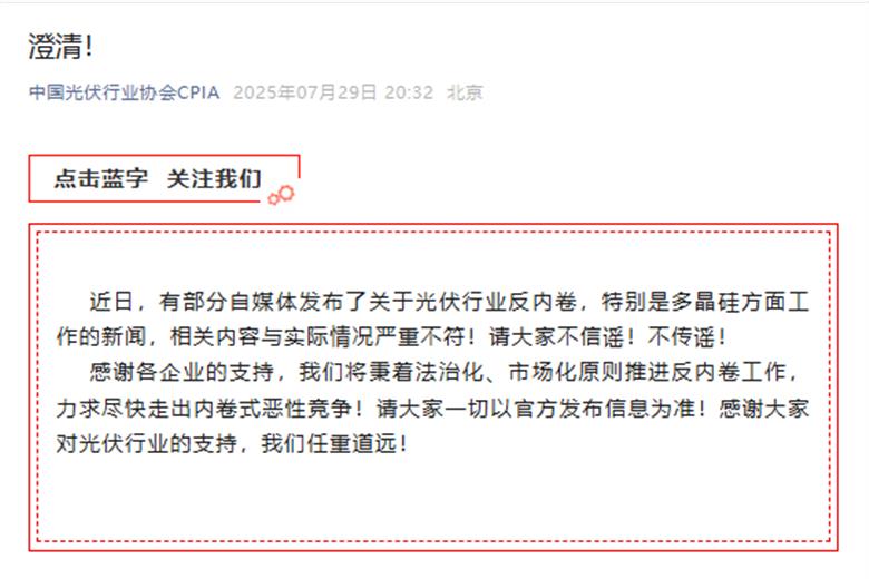 【中國(guó)光伏行業(yè)協(xié)會(huì)發(fā)布辟謠公告】近日,有部分自媒體發(fā)布了關(guān)于光伏行業(yè)反內(nèi)卷,特別是多晶硅方面工作的新聞,相關(guān)內(nèi)容與實(shí)際情況嚴(yán)重不符!請(qǐng)大家不信謠!不傳謠!感謝各企業(yè)的支持,我們將秉著法治化、市場(chǎng)化原則推進(jìn)反內(nèi)卷工作,力求盡快走出內(nèi)卷式惡性競(jìng)爭(zhēng)!請(qǐng)大家一切以官方發(fā)布信息為準(zhǔn)!感謝大家對(duì)光伏行業(yè)的支持,我們?nèi)沃氐肋h(yuǎn)?。ㄖ袊?guó)光伏行業(yè)協(xié)會(huì)CPIA)