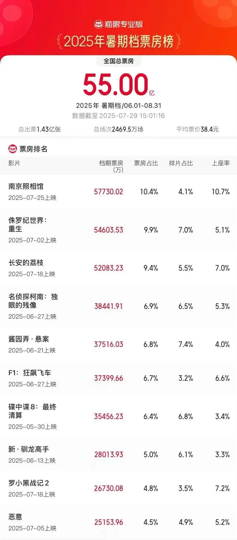 【2025暑期檔電影總票房破55億】據(jù)網(wǎng)絡(luò)平臺(tái)數(shù)據(jù),截至7月29日14時(shí)57分,2025年暑期檔(6月至8月)電影總票房(含預(yù)售)突破55億。(廣角觀察)