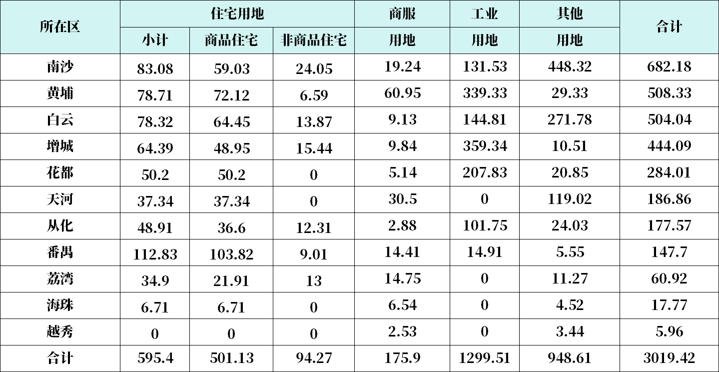 2024年,廣州計劃供地3019公頃,工業(yè)用地1300公頃。與2023年相比,供地的公頃數(shù)有下降,但工業(yè)用地有增加。廣州市11個區(qū)計劃供應(yīng)用地量和占全市比例分別為:南沙區(qū)682公頃,占23%;黃埔區(qū)508公頃,占17%;白云區(qū)504公頃,占17%;增城區(qū)444公頃,占15%;花都區(qū)284公頃,占9%;天河區(qū)187公頃,占6%;從化區(qū)178公頃,占6%;番禺區(qū)148公頃,占5%;荔灣區(qū)61公頃,占2%;海珠區(qū)18公頃,占1%;越秀區(qū)6公頃,占0.2%。附件:廣州市2024年建設(shè)用地供應(yīng)計劃(完整版)