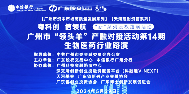 為建設(shè)廣州市資本市場(chǎng)融資對(duì)接服務(wù)平臺(tái)(廣州風(fēng)投創(chuàng)投綜合服務(wù)平臺(tái)),更好地服務(wù)廣州市“領(lǐng)頭羊”擬上市企業(yè)和創(chuàng)新型中小企業(yè),2024年5月29日,廣州資本市場(chǎng)高質(zhì)量發(fā)展系列“粵科創(chuàng),信領(lǐng)航”廣州市“領(lǐng)頭羊”產(chǎn)融對(duì)接活動(dòng)第14期生物醫(yī)藥行業(yè)路演將在天河區(qū)舉行,歡迎企業(yè)、投資機(jī)構(gòu)參加交流。