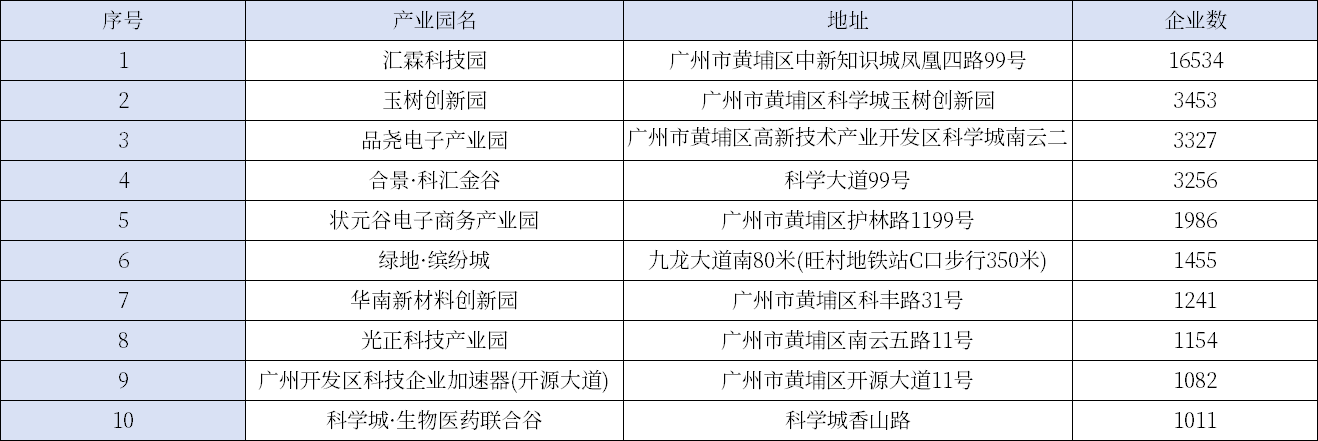 (廣州市黃埔區(qū)產業(yè)園園區(qū)內企業(yè)數TOP10)